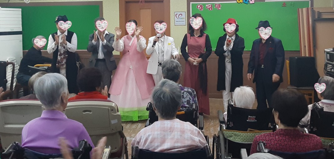 트로트 노래, 마술, 역활극등의 민병용예술단의 공연을 보시며 즐겁게 박수도 치시고 어깨도 들썩들썩하며 흥겨운 시간을 보내셨습니다.